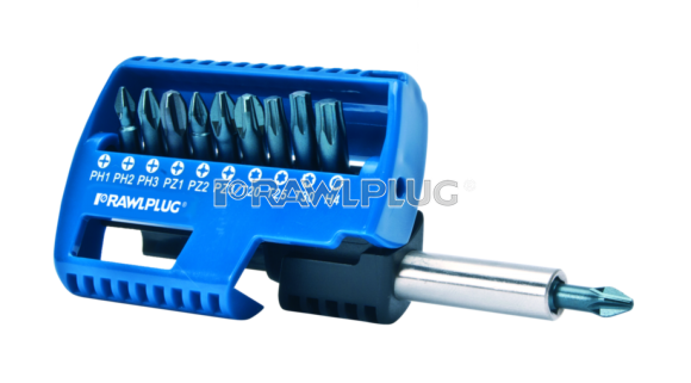 • A set of the most popular types and sizes of bits for screwdriving and fastening applications
